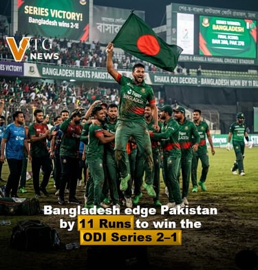 Bangladesh secured a thrilling ODI series victory over Pakistan after winning the third and deciding match by 11 runs in Dhaka. The victory gave Bangladesh a 2–1 triumph in the three-match series and marked a memorable performance for the home side.